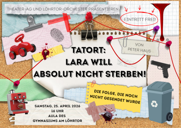 Die Theater-AG der Mittelstufe lädt am Samstag, den 25. April, um 16 Uhr herzlich in unsere Aula ein, um die Komödie von Peter Haus zu genießen, in der eine absurde Situation die nächste jagt. Für Livemusik in den Umbaupausen sorgt das Orchester unserer Schule. Wir freuen uns über jeden, der kommt!